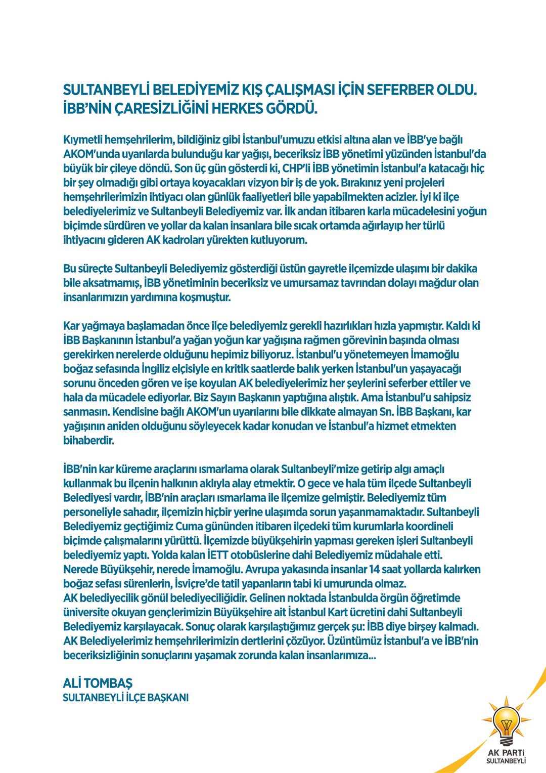 Başkan Tombaş’ın açıklaması şöyle: “Kıymetli hemşehrilerim, bildiğiniz gibi İstanbul’umuzu etkisi altına alan ve İBB’ye bağlı AKOM’unda uyarılarda bulunduğu kar yağışı, beceriksiz İBB yönetimi yüzünden İstanbul’da büyük bir çileye döndü. Son üç gün gösterdi ki, CHP’li İBB yönetimin İstanbul’a katacağı hiç bir şey olmadığı gibi ortaya koyacakları vizyon bir iş de yok. Bırakınız yeni projeleri hemşehrilerimizin ihtiyacı olan günlük faaliyetleri bile yapabilmekten acizler. İyi ki ilçe belediyelerimiz ve Sultanbeyli Belediyemiz var. İlk andan itibaren karla mücadelesini yoğun biçimde sürdüren ve yollar da kalan insanlara bile sıcak ortamda ağırlayıp her türlü ihtiyacını gideren AK kadroları yürekten kutluyorum.
